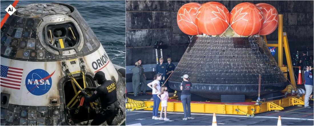تُظهر الصورة كبسولة فضائية في البحر عليها اسم "أوريون" وشعار ناسا وعلم الولايات المتحدة، وأحد عناصر الإنقاذ.