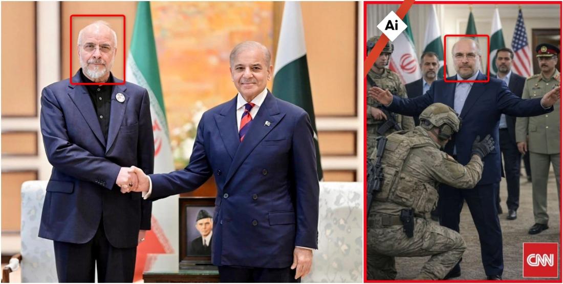 إذ يُمكن ملاحظة اختلافٍ واضح في تفاصيل وجه قاليباف بين الصورة المتداولة وصورة له وزّعتها وكالة فرانس برس، خلال لقائه رئيس الوزراء الباكستاني في 11 نيسان/أبريل في باكستان قبل انطلاق المفاوضات بساعات.