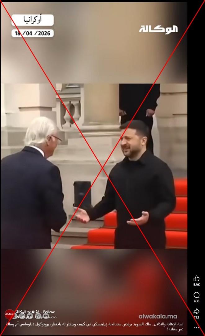 غداة استقبال الرئيس الأوكراني فولوديمير زيلينسكي الملك السويدي كارل السادس عشر غوستاف في مدينة لفيف الأوكرانية في 17 نيسان/أبريل، تداول مستخدمون لمواقع التواصل الاجتماعي فيديو زعم ناشروه أنّه يُظهر رفض الملك السويدي مصافحة زيلينسكي. إلا أن المقطع في الحقيقة مجتزأ، ففي المشهد الكامل للاستقبال يظهر الرجلان وهما يتصفحان، وقد شهدت الزيارة مصافحات أخرى بينهما.