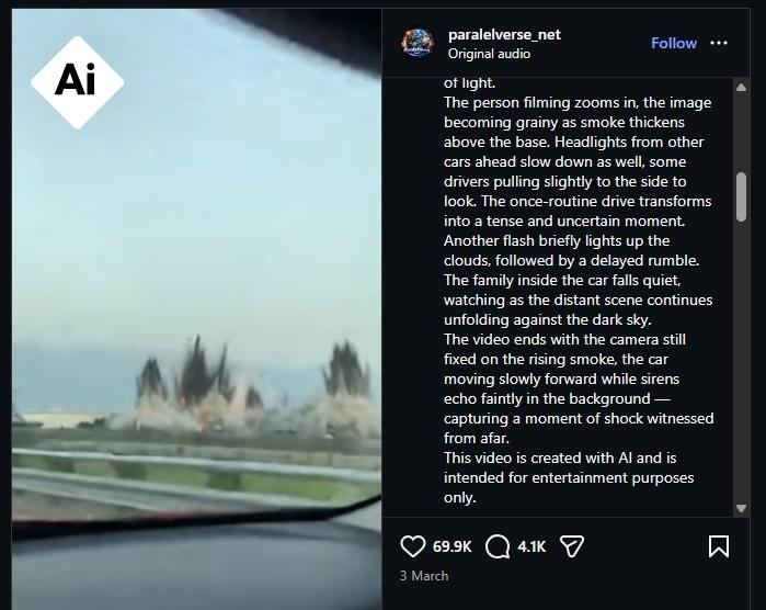 وباستخدام لقطات من النسخة الأوضح في البحث، يمكن العثور على الفيديو منشوراً بتاريخ 3 آذار/مارس على حساب في موقع إنستغرام، حيث أشار صاحبه إلى أنّه "مولّد باستخدام الذكاء الاصطناعي وهو مخصّص لأغراض ترفيهية فقط". (أرشيف)