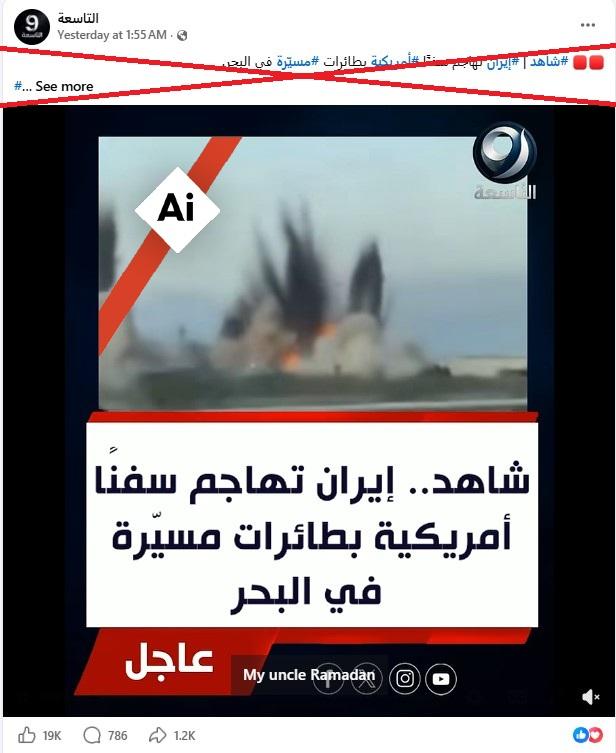 تعهدت إيران في 20 نيسان/أبريل بـ"الرد قريباً" على مهاجمة البحرية الأميركية لإحدى سفنها التجارية وإنزال جنود على متنها، بينما كانت السفينة تحاول كسر الحصار الأميركي المفروض على الموانئ الإيرانية. في هذا الإطار، تداول مستخدمون لمواقع التواصل الاجتماعي فيديو مؤلّف من مقطعين زعم ناشروه أنّه لاستهداف سفن أميركية بطائرات مسيّرة إيرانية. إلا أن الادّعاء غير صحيح، فالمقطع الأول مولّد باستخدام الذكاء الاصطناعي، أما المقطع الثاني فيعود لعام 2018.