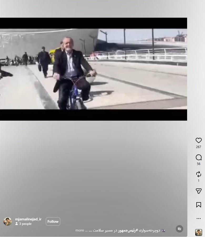 وجاء في التعليق المرافق أنّ الفيديو يُظهر جولة ميدانية للرئيس الإيراني وهو يستقل دراجة هوائية برفقة محافظ أصفهان خلال زيارة رسمية للمدينة.