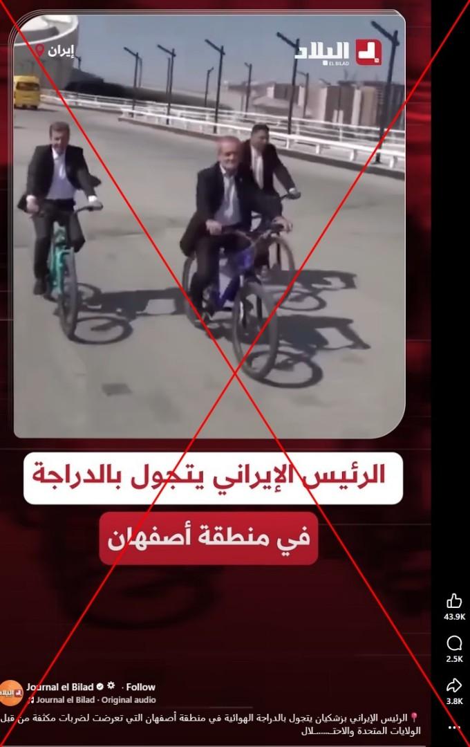 إلا أنّ المقطع المتداول على أنه يصوّر جولة للرئيس الإيراني مسعود بيزشكيان على الدراجة الهوائية في أصفهان خلال الهدنة هو مصوّر في الحقيقة قبل اندلاع الحرب.