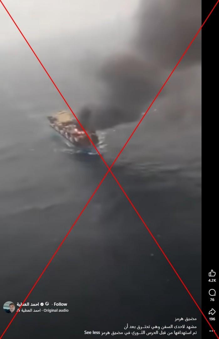 أعلن الحرس الثوري الإيراني في 22 نيسان/أبريل أن قواته البحرية احتجزت سفينتين حاولتا عبور مضيق هرمز واقتادتهما إلى المياه الإقليمية للجمهورية الإسلامية. في هذا الإطار، تداول مستخدمون لمواقع التواصل الاجتماعي فيديو زعم ناشروه أنّه يُظهر احتراق سفينة بعد استهدافها من قبل الحرس الثوري في مضيق هرمز. إلا أنّ الفيديو في الحقيقة يعود لحريق على متن سفينة قبالة ولاية غوا الهندية عام 2024.