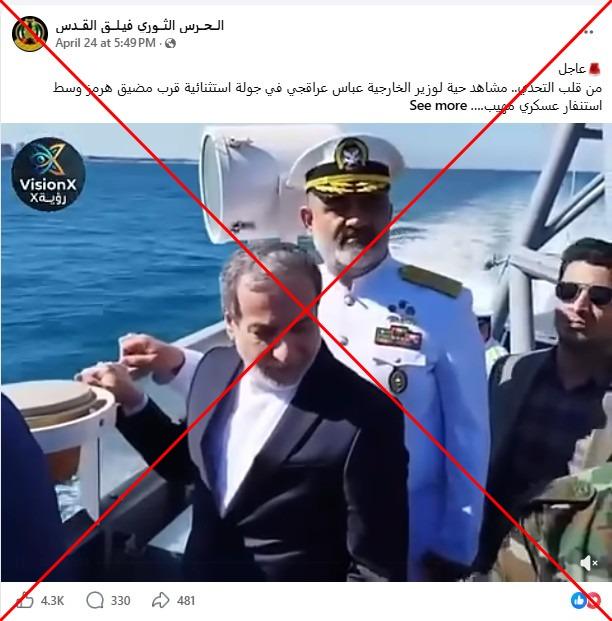 أعلن الحرس الثوري الإيراني في 25 نيسان/أبريل أن السيطرة على مضيق هرمز هي "استراتيجية حازمة" لطهران في نزاعها مع الولايات المتحدة. في هذا السياق، تداول مستخدمون لمواقع التواصل الاجتماعي فيديو زعم ناشروه أنه لجولة حديثة قام بها وزير الخارجية الإيراني عباس عراقجي قرب مضيق هرمز. إلا أن المقطع في الحقيقة يعود لمشاركة عراقجي في احتفالاتٍ بيوم البحرية الإيرانيّة عام 2024.