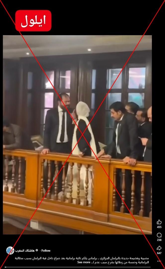 تداولت صفحات وحسابات على مواقع التواصل الاجتماعي فيديو قيل إنّه يُظهر شجاراً وتضارباً في البرلمان الجزائري وزعمت صفحات أخرى أنّه مصوّر في المغرب. لكن هذا الادّعاء غير صحيح فالمقطع مصوّر في الحقيقة في محكمة لاهور العليا الشهر الماضي خلال انتخابات نقابة المحامين في باكستان.