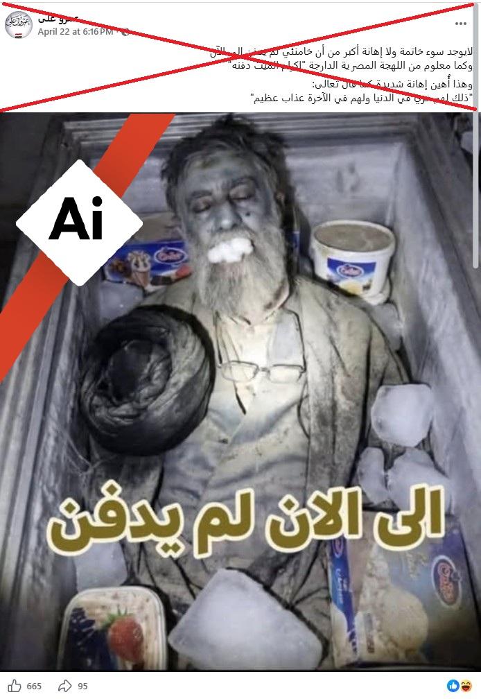 اغتيل المرشد الأعلى السابق للجمهورية الإسلامية آية الله علي خامنئي في مطلع الهجوم الأميركي الإسرائيلي على إيران في 28 شباط/فبراير. وبسبب الحرب، لم يكن من الممكن تنظيم جنازة له على المستوى الوطني. في هذا السياق، تداول مستخدمون لمواقع التواصل الاجتماعي صورة زعم ناشروها أنّها لجثة خامنئي محفوظة في ثلاّجة. إلا أن الصورة في الحقيقة مولّدة باستخدام الذكاء الاصطناعي.