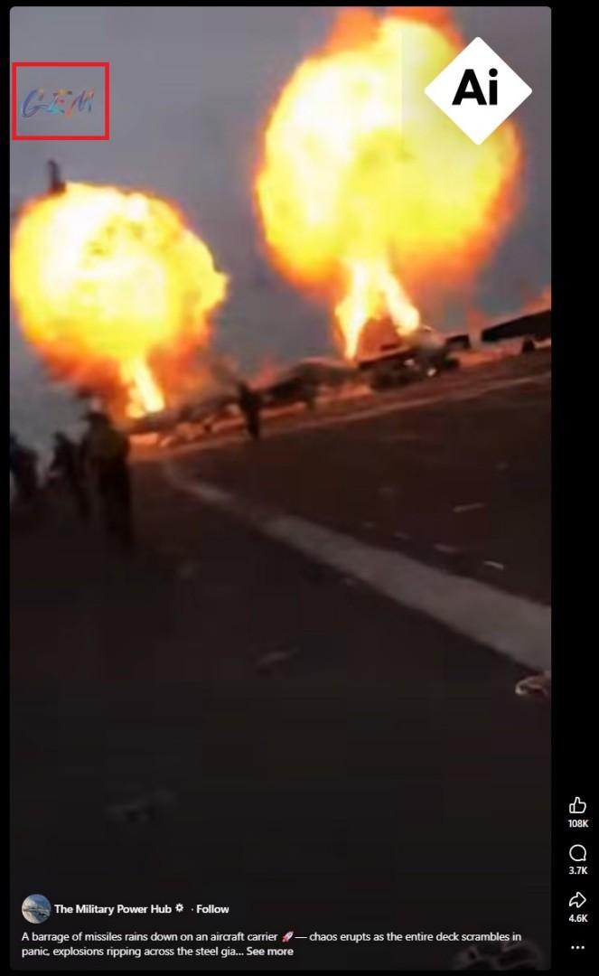 إلا أن الفيديو المتداول على أنه يصوّر استهداف حاملة طائرات أميركية مولّد باستخدام الذكاء الاصطناعي.