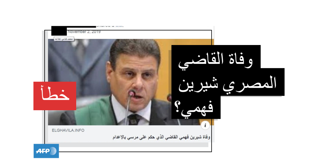 تداول مئات مستخدمي موقع فيسبوك باللغة العربية خبراً عن وفاة القاضي محمد شيرين فهمي، أحد القضاة الذين حاكموا الرئيس المصري السابق محمد مرسي، في حادث سير، لكن هذا الخبر غير صحيح.