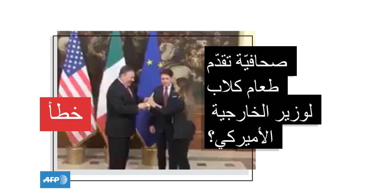يظهر في هذا الفيديو وزير الخارجية الأميركي مايك بومبيو وهو يقترب من رئيس الوزراء الإيطالي جوزيبي كونتي ويصافحه، فتفاجؤه امرأة تقترب منه وتقدم له شيئا وهي تخاطبه، فيأخذه منها.