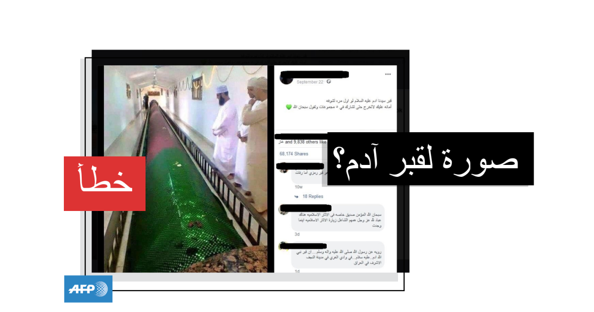 يبدو في الصورة ضريحٌ ضخمٌ يمتدّ على أمتارٍ عدّة، يقف إلى جانبه عدد من الزائرين داخل غرفةٍ مطليّة باللون الأبيض. وجاء في النصّ المرافق لها "قبر سيدنا آدم عليه السلام (..) لا تخرج حتى تشارك في خمس مجموعات وتقول سبحان الله".