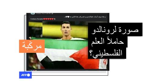 الصورة الصراع الفلسطيني الإسرائيلي تاريخ النشر 08/11/2023 هذه الصورة لرونالدو حاملاً العلم الفلسطيني مركّبة وهي في الحقيقة للاعب المغربي جواد الياميق