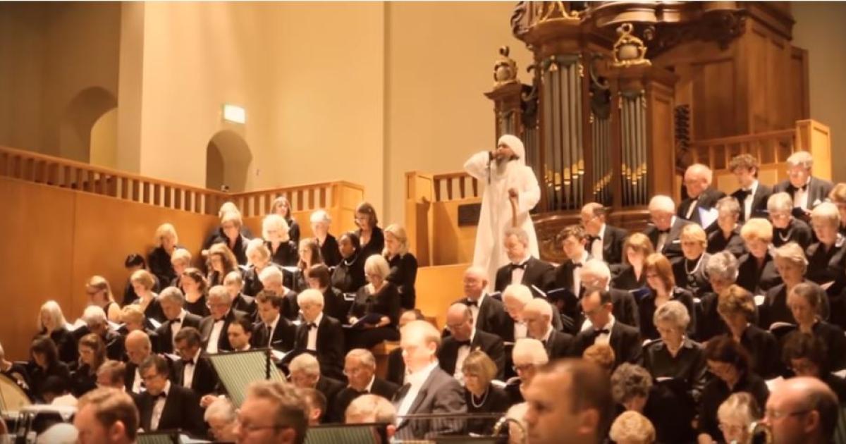 يُظهر المقطع أوركسترا تؤدي عملاًغنائياً في ما يبدو أنها كنيسة، ثم يتقدّم رجل في عباءة بيضاء ويقف في مكان مرتفع، فيتوقّف العزف والغناء ويرفع الرجل الأذان.