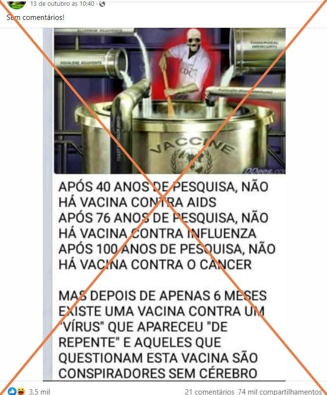 As publicações viralizadas, que demonstram desconfiança nas vacinas para prevenir a covid-19 ao afirmar que não existem até o momento vacinas contra a aids e o câncer, propõem, contudo, uma falsa dicotomia.