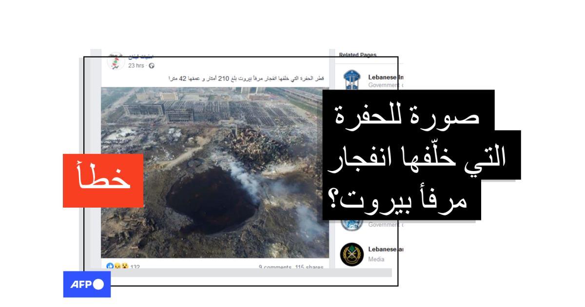 غداة الانفجار الهائل الذي وقع الثلاثاء في مرفأ بيروت، انتشرت على مواقع التواصل الاجتماعي صورة لحفرة ضخمة على أنّها لمكان الانفجار. لكنّ الصورة في الحقيقة تعود لانفجار وقع في الصين عام 2015.