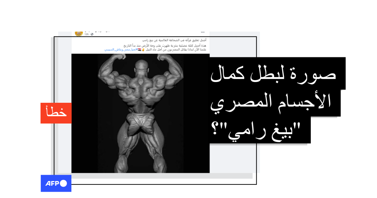 تداول مستخدمون لمواقع التواصل الاجتماعي صورة يدّعي ناشروها أنّها تظهر بطل كمال الأجسام المصري ممدوح السباعي الملقب بـ"بيغ رامي"، وذلك بعد فوزه بلقب "مستر أولمبيا 2020". لكنّ الصورة في الحقيقية تظهر مجسّماً نفّذه فنّان رقميّ لبطل كمال الأجسام الأميركي روني كولمان.