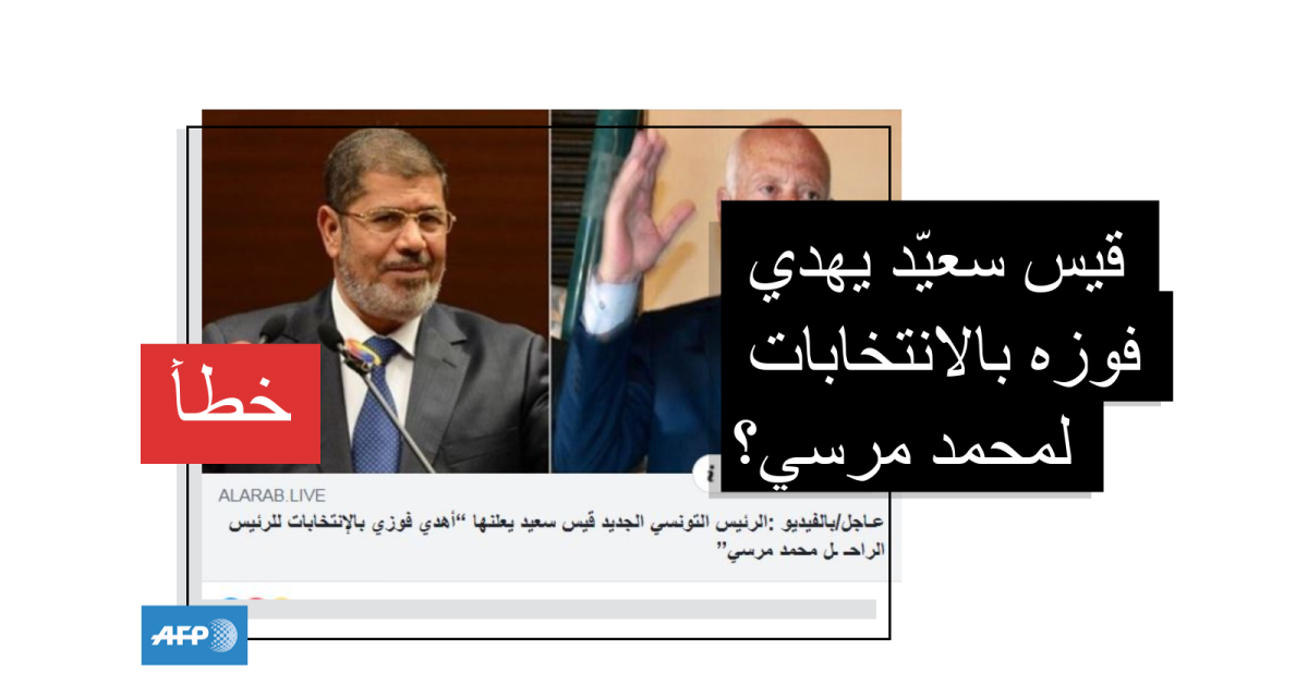 لكن خبر إهداء الفوز إلى محمد مرسي غير صحيح، فالخطاب الذي ألقاه قيس سعيّد بعيد إعلان فوزه بالإنتخابات خلا مما نُسب إليه.