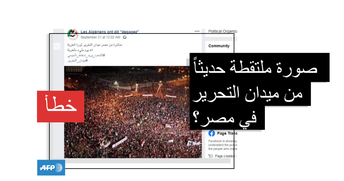 وقد نشرتها هذه الصفحة على أنها ملتقطة في ميدان التحرير في القاهرة مساء السبت 21 أيلول/سبتمبر 2019 لتظاهرة تطالب برحيل الرئيس عبد الفتاح السيسي. وشاركها مئات المستخدمين على موقع فيسبوك.