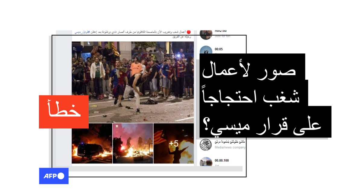 تبدو في الصور (3,2,1) نيران مندلعة في الشوارع ومواجهات مع الشرطة، وجاء في النصّ المرافق لها "أعمال شغب وتخريب الآن بالعاصمة الكاتالونيّة من طرف أنصار نادي برشلونة بعد إعلان ميسي رحيله عن الفريق".